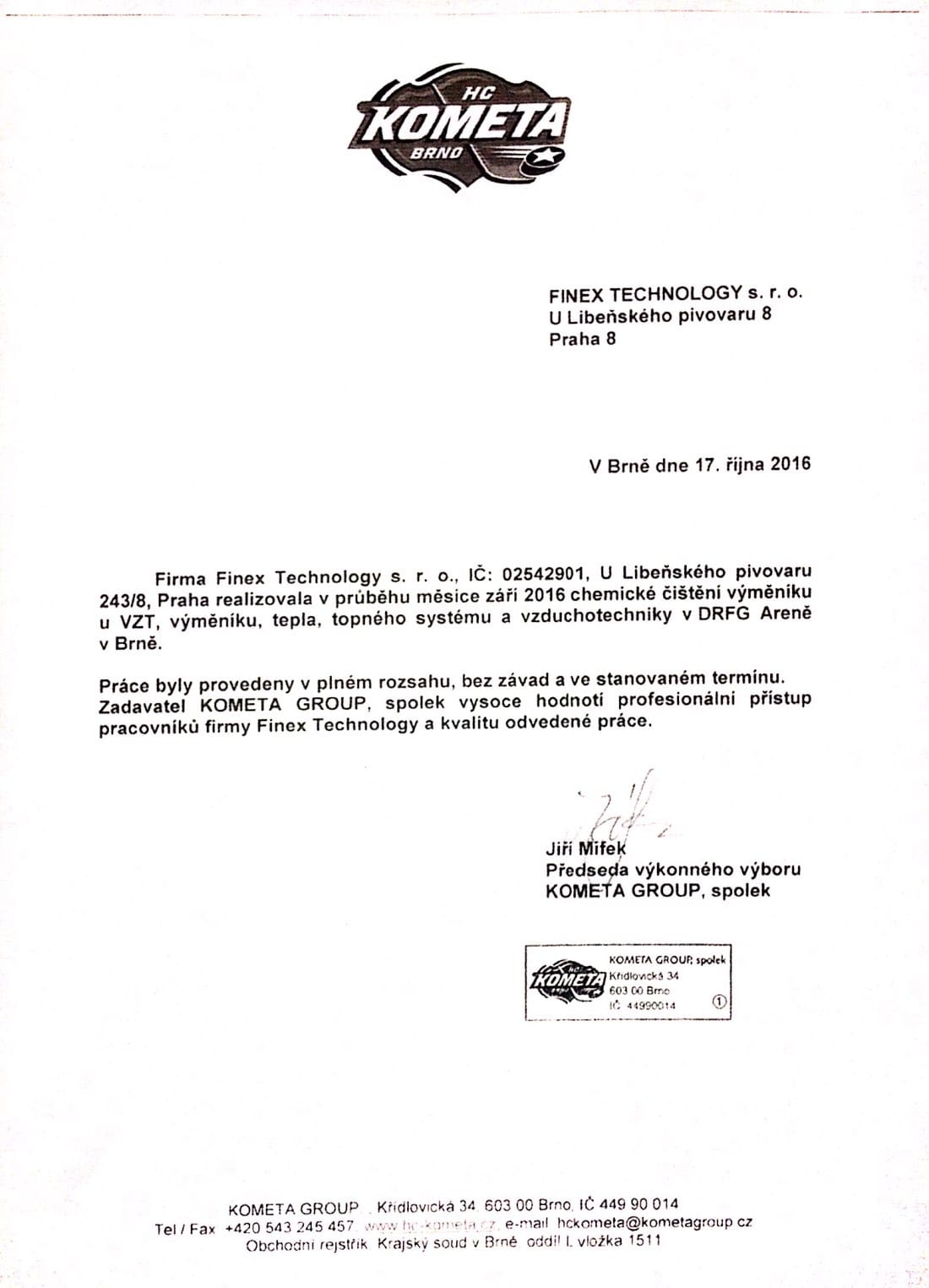Práce byly provedeny v plném rozsahu, bez závad a ve stanoveném termínu. Zadavatel KOMETA GROUP vysoce hodnotí profesionální přístup pracovníků firmy Finex Technology a kvalitu odvedené práce.