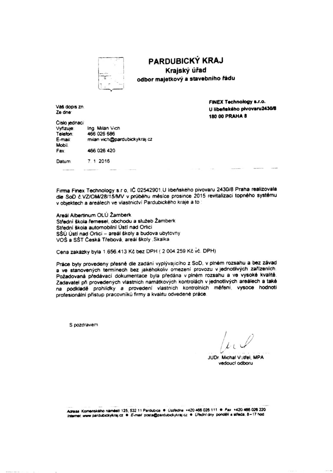 Zadavatel při provedení vlastních namátkových kontrol v jednotlivých areálech a také na podkladě prohlídky a provedení vlastních kontrolních měření, vysoce hodnotí profesionální přístup pracovníků Finex Technology a kvalitu odvedené práce.
